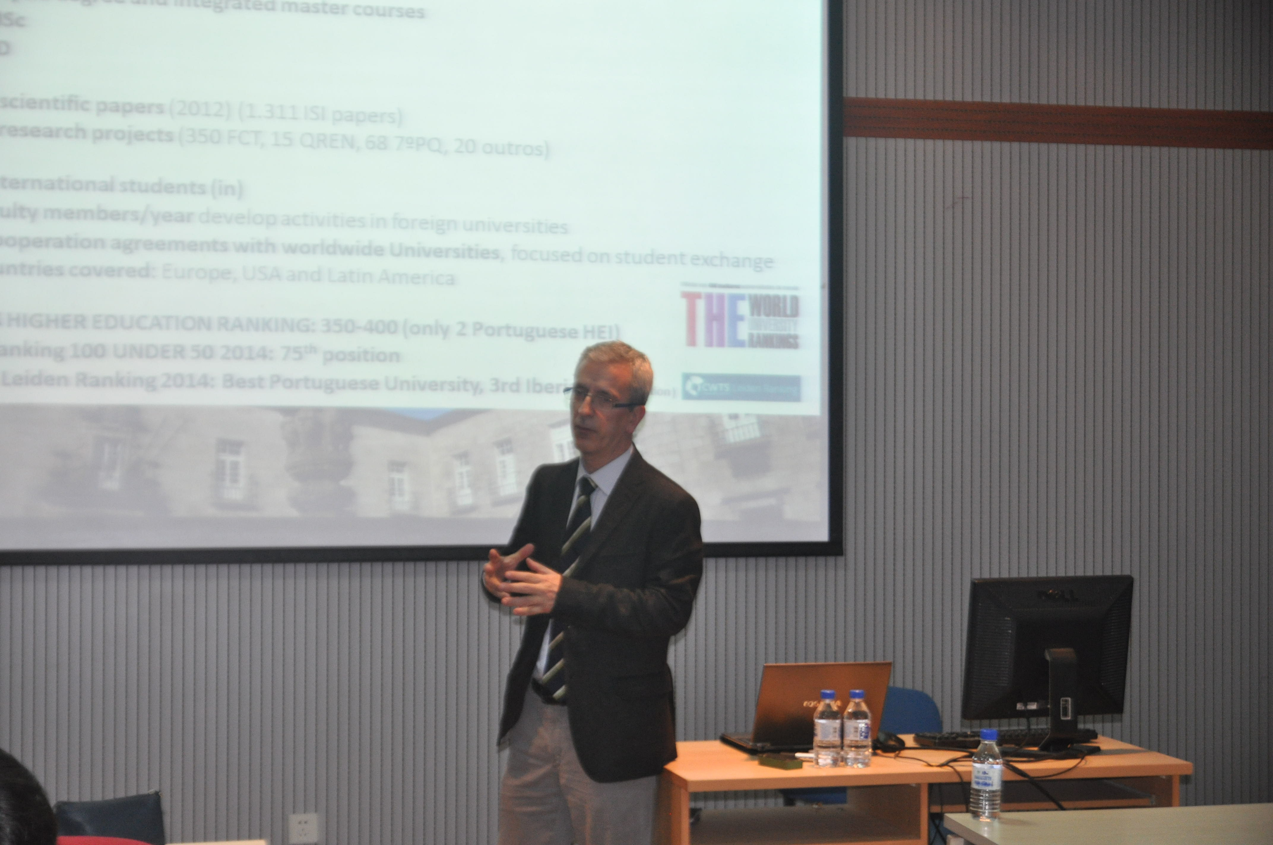 Monteiro教授首先介绍了葡萄牙米尼奥大学工程学院的基本概况,并着重介绍了学院的研究成果以及科研项目的进展情况。随后,Pereirao教授详细介绍了葡萄牙米尼奥大学Algoritmi研究中心在信息和通信技术以及电子领域的研发工作,具体包括电子工程、电子和纳米科技、运筹学、统计和数值方法、信息系统、软件和多媒体、计算机网络和普适计算等多个领域的研究进展。两位教授分别结合其正在主持和参与的欧盟科研项目讲述了物联网和嵌入式系统领域的多个热点问题。