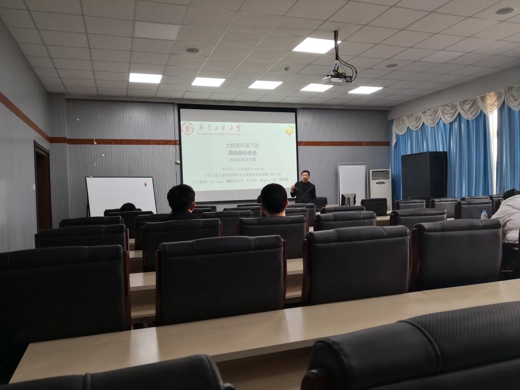A521做了题为“大数据背景下的网络身份安全”的学术报告。刘文印博士目前任广东工业大学计算机学院特聘教授、博士生导师。刘文印博士因在图形识别及反网络钓鱼欺诈等研究领域的杰出贡献,于2003年获国际模式识别学会颁发文档分析与识别领域杰出青年科学家奖,于2010年入选国际模式识别学会会士。2015年入选广东省第五批引进创新科研团队带头人,创立网络身实验室,致力于研发国际领先的网络身份安全技术。