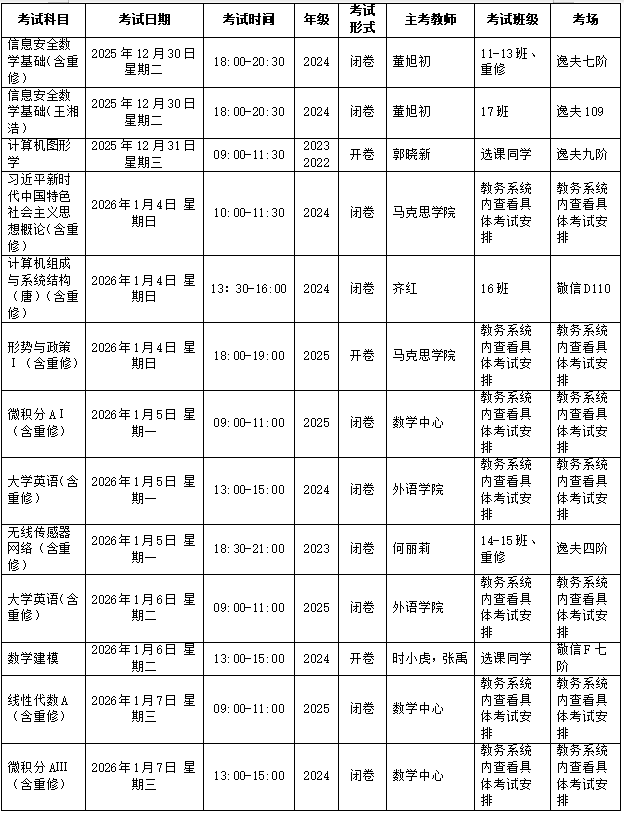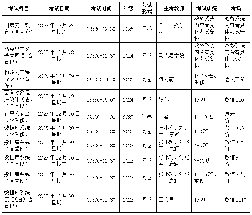本学期第18周到考试周期末考试安排如下: