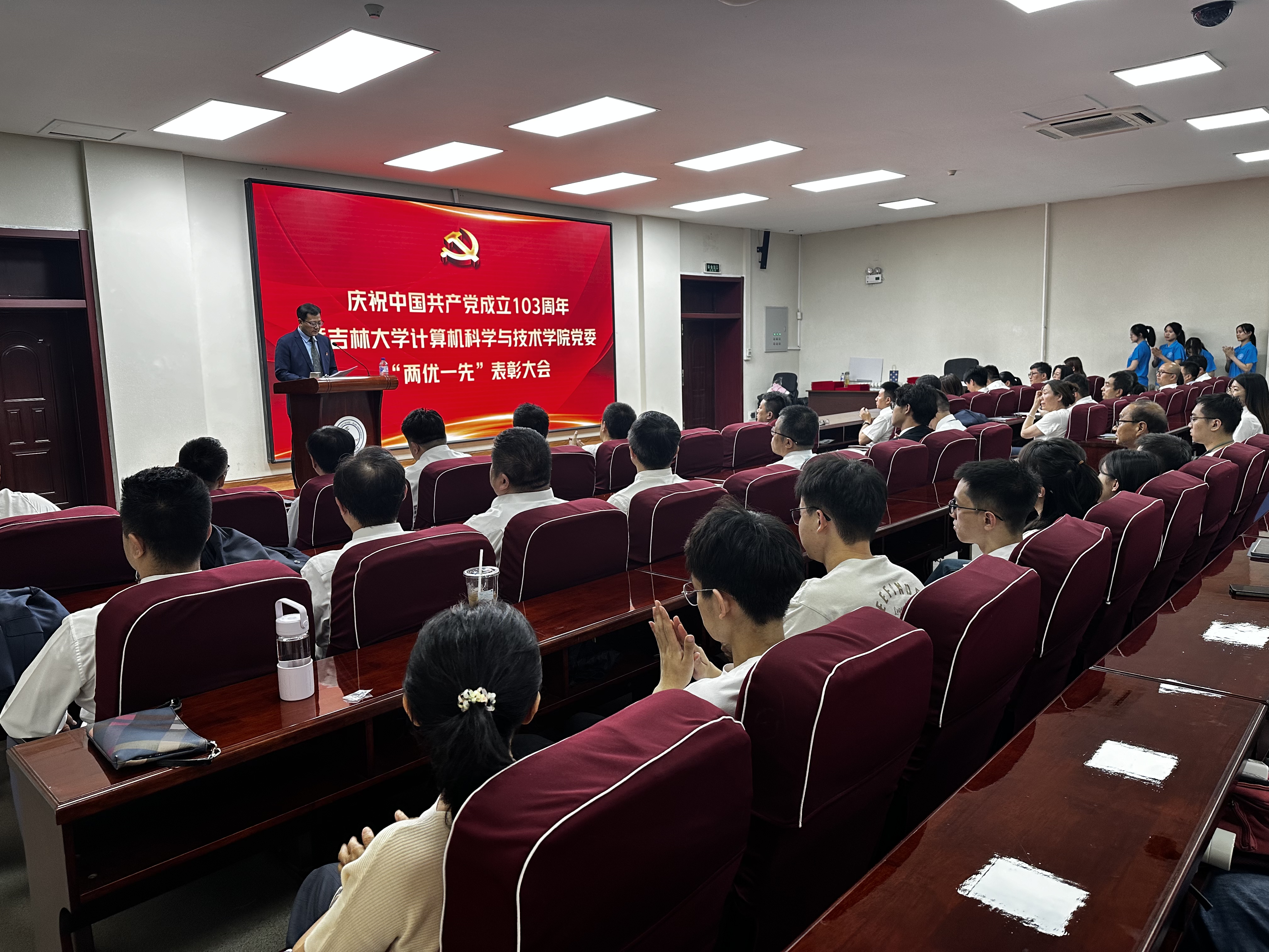 为庆祝中国共产党成立103周年,充分展示学院党委基层党支部和党员在各项工作中取得的丰硕成果和精神风范,大力弘扬信念坚定、对党忠诚、勇于担当、无私奉献的崇高品格,71日,av天堂 党委在王湘浩楼B108报告厅召开“两优一先”表彰大会,对优秀党员、优秀党务工作者和先进基层党支部进行表彰,学院全体领导班子成员、党委委员、纪委委员、党支部书记、支部委员、受表彰人员和师生党员代表130余人参加了本次表彰大会。会议由院长杨博同志主持。大会在雄壮的国歌声中拉开帷幕。