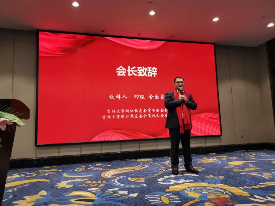 浙江校友会计算机分会金国庆会长致辞,金会长代表校友表达了对母校领导、老师,以及校友总会的感谢,表示愿积极建构共同成长的校友之家,在服务好广大校友的基础上,鼓励和支持计算机校友们进行创新与创业,创造更大价值,共同助力母校和学院更上新台阶。金会长捐款20万元,用于支持浙江校友会计算机分会的建设与发展。