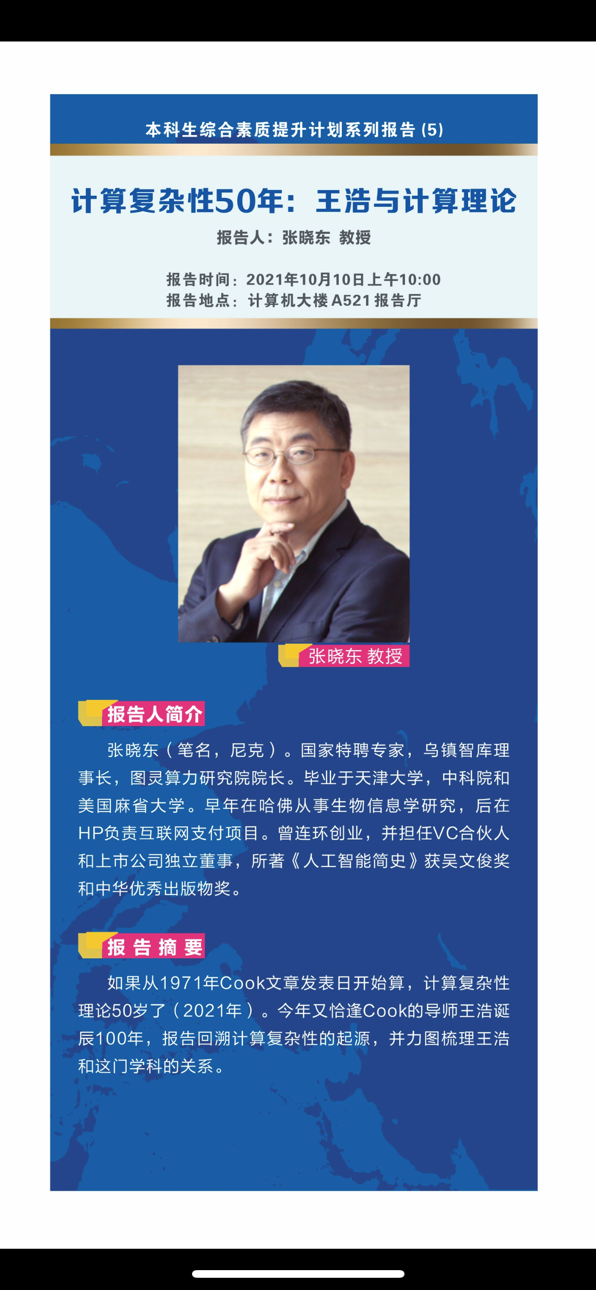 中心校区计算机楼A521报告厅作了题为“计算复杂性50年:王浩与计算理论”的专题报告,这是本科生综合素质提升计划系列报告的第五场,报告由av天堂