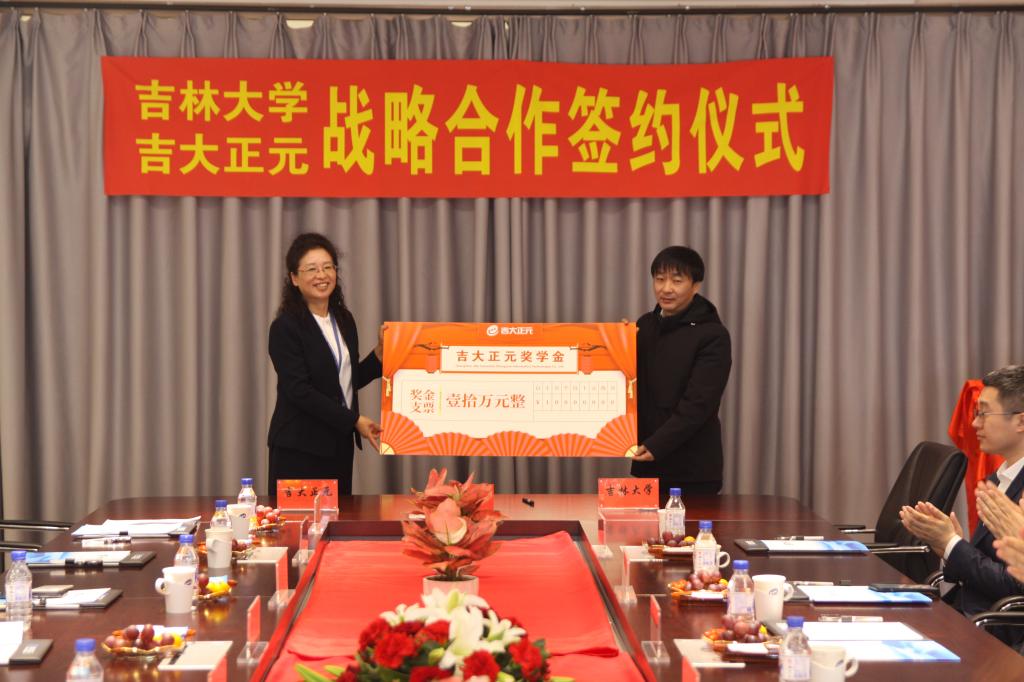 党委副书记高战国交接“吉大正元”奖学金资助标识牌。av天堂