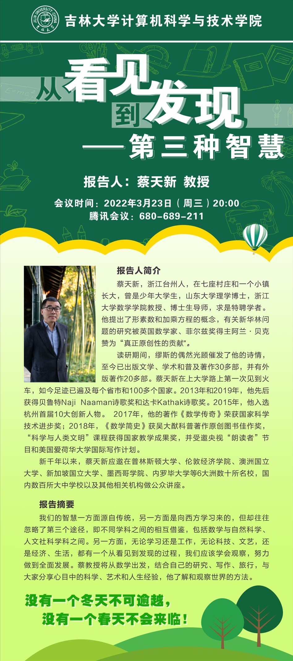 2022年3月23日 20:00,浙江大学数学科学学院教授、博士生导师、求是特聘学者、数论学家,诗人、作家蔡天新先生应av天堂