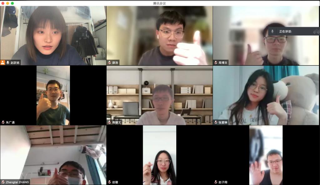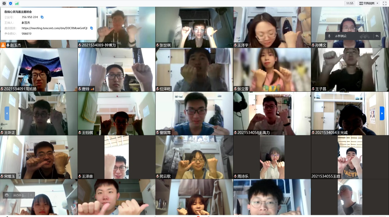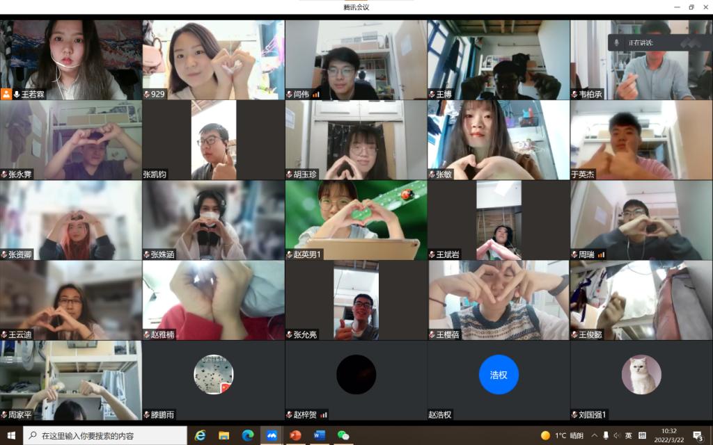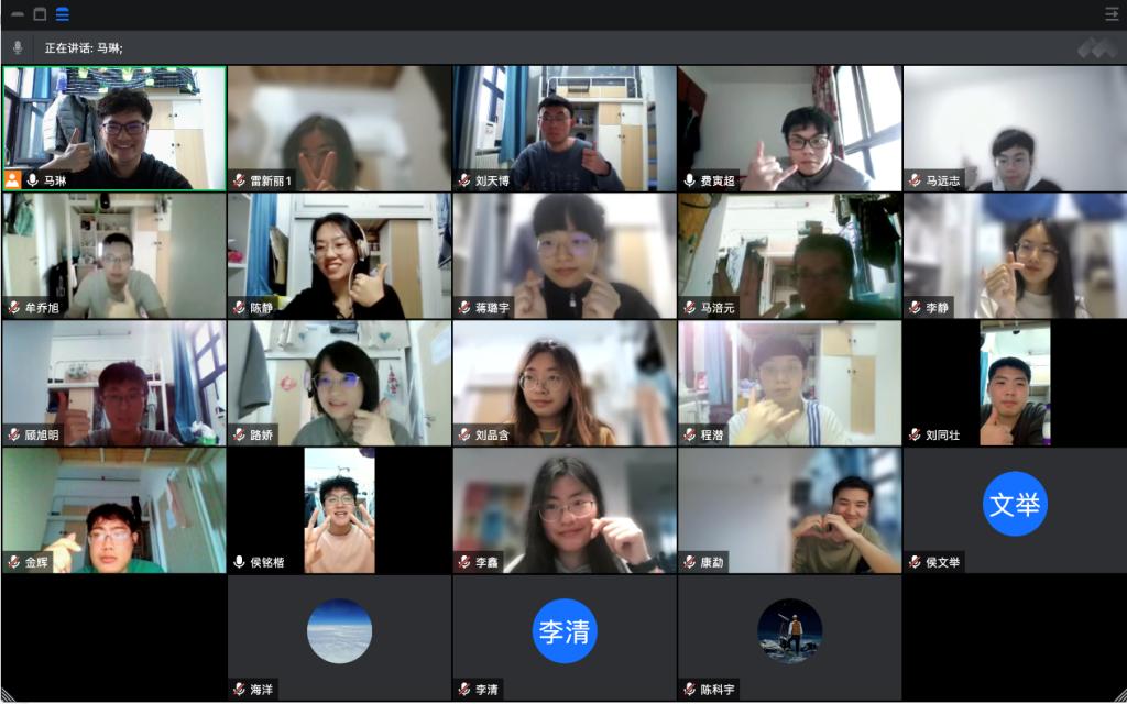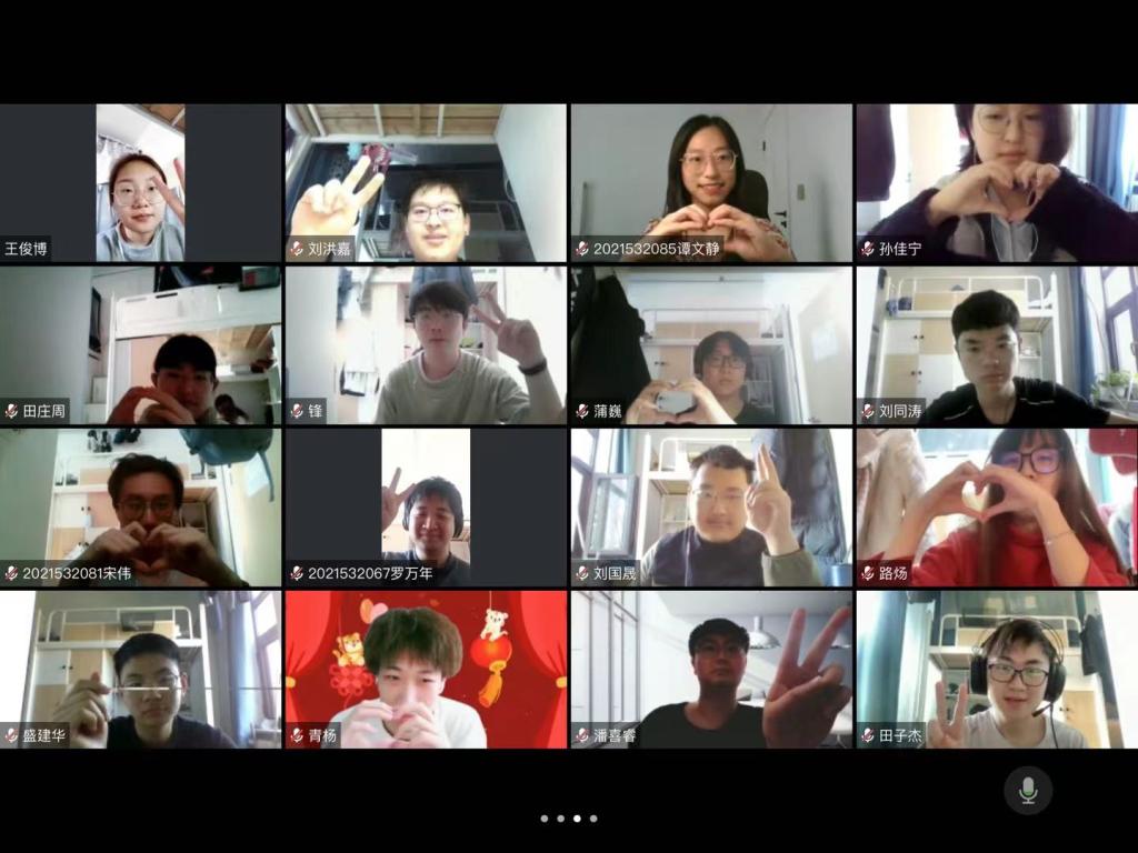 分享经验和计划后,活动逐渐进入尾声,同学们在屏幕前,比着手势完成合影,留下了心灵沟通的美好见证。一张张合影中满眼笑意,此时此刻的同学们心里,温暖的春天才算是真正地来临。疫情不抑心,我们携手同行,满怀希望,期待着万物复苏的那一天。