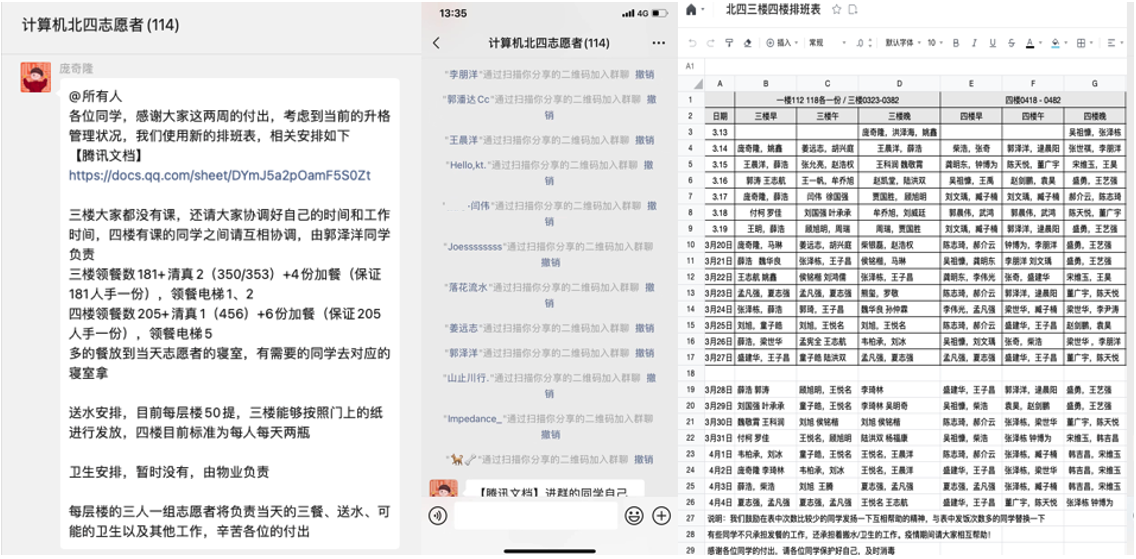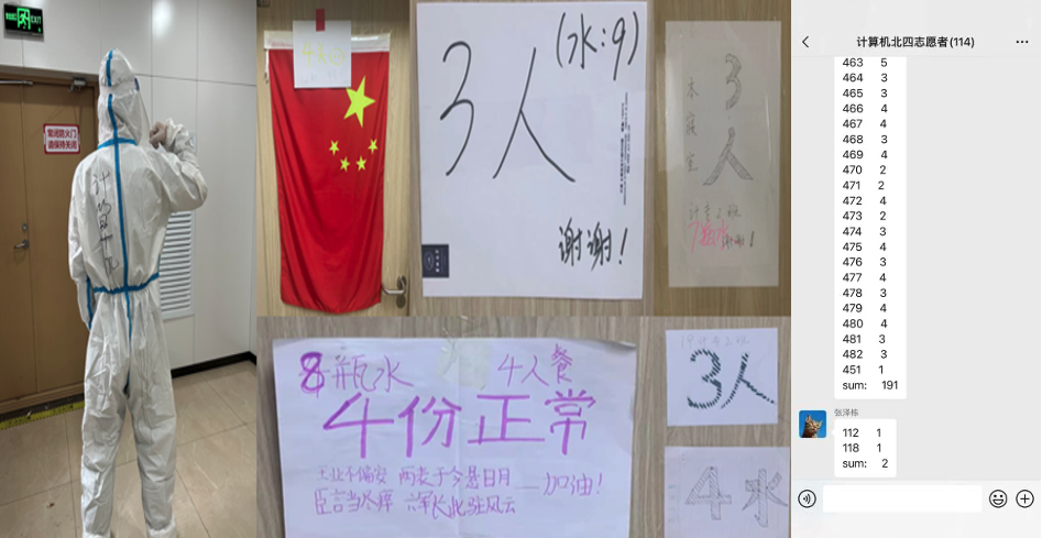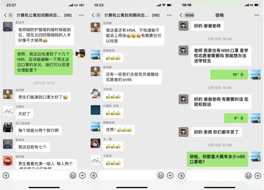 疫情吹响了战斗的号角,计算机研究生在接到学院高战国副书记的倡议后,开始踊跃报名参加志愿服务,全力以赴,共克时艰。在短短几分钟,申请出战的志愿者名字填满了在线征集表格。学硕三支部的庞奇隆作为北四志愿队的队长,从那一刻起,除了要完成各种数据统计和宣传任务外,还要全天守着手机,在各种通知群、工作群、志愿者群里不停地的切换,为的就是确保每一条消息及时传达到每一位志愿者和同学。在组织北四100多名志愿者具体工作时,他耐心分配、解答工作,对同学们的个人需求,悉心回应,收到楼长老师的调度要求,迅速响应,他的寝室门前,已成为物资集散地。在庞队长的组织下,在大家共同的努力下,楼层的送餐、物资发放效率大大提高。截至目前,计算机学院的志愿者队伍已经达到了110余人,累计安排送餐余次。志愿者们用晚睡早起的生活节奏,践行着自己作为一名共产党员的坚守与承诺。