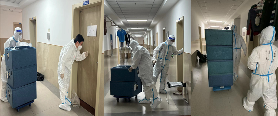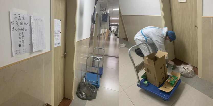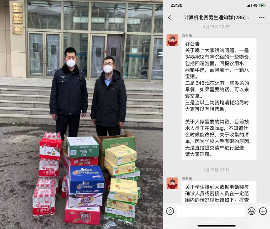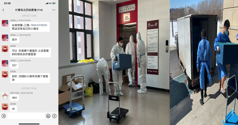起初,北四志愿者们由于缺乏必要的口罩等防护用品无法开展工作,听到这样的消息,同学们纷纷贡献出了自己的口罩、手套。北三的女同学、甚至还有已经毕业的师兄师姐,也委托辅导员送来宝贵的防疫物资。由于搬运物资需要小推车,刘威廷和孙博文同学第一时间将自己的小推车推到了志愿者的跟前,从此计算机志愿者也成了有车的“大户人家”,他们使用多辆小推车一起合作,穿梭在北四的这边与那边,为的就是让同学们都能吃上热乎的饭菜。