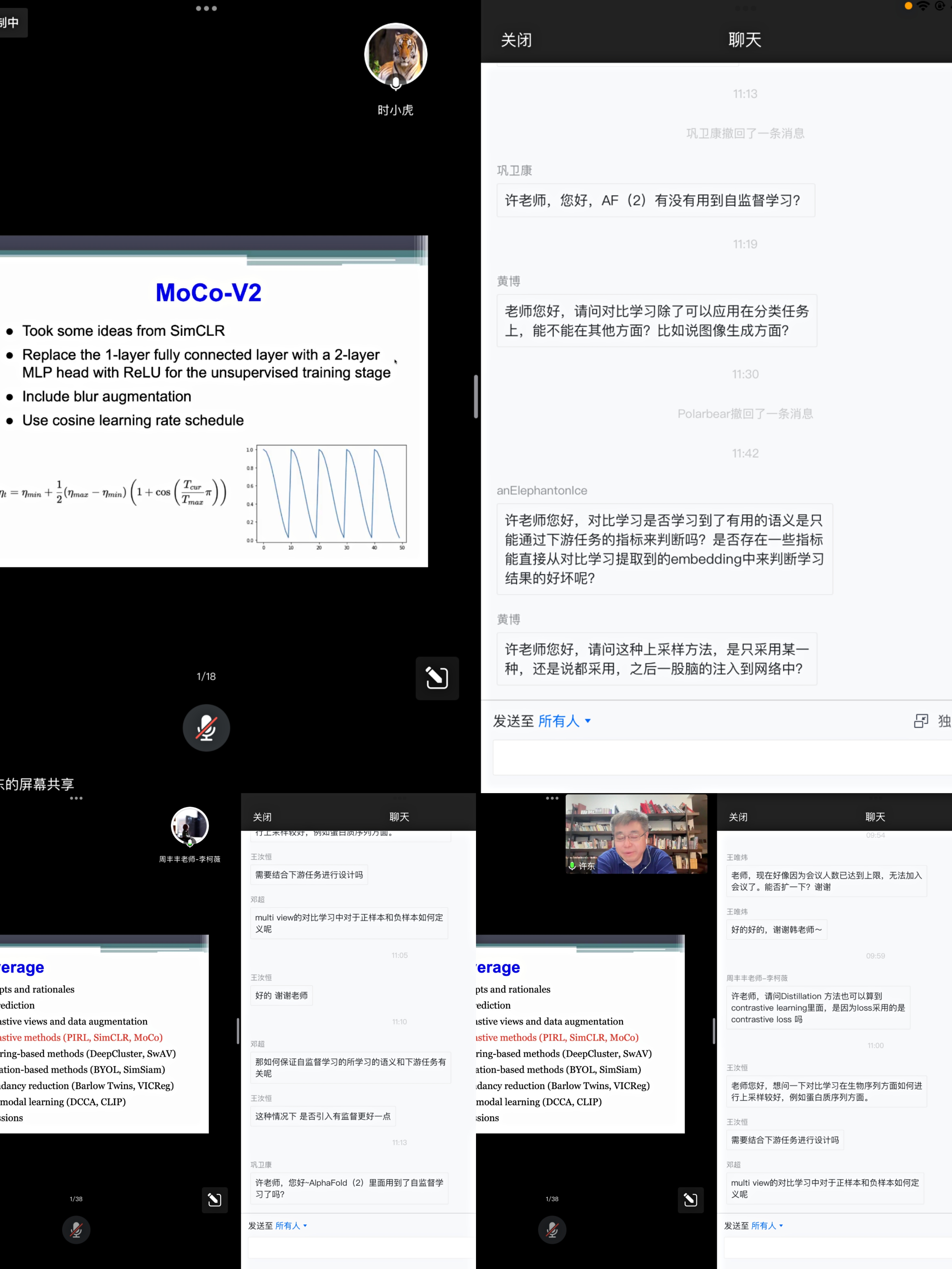在报告的最后,许东教授给出了自监督学习与监督学习性能上直观的比较,说明了自监督学习更优的原因,从不同角度对现有的自监督学习的模型进行了分类并指出了未来自监督学习的发展方向以及目前所遇到的挑战。在讲座中及讲座后的讨论时间里,许东教授悉心回答了老师和同学们的问题。首日超过300位同学和老师参加了本次报告,并受到了av天堂