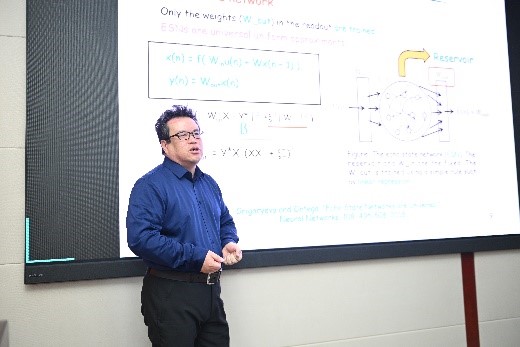 崔佳旭副教授做了精彩报告。苗兵教授深入剖析了复杂系统中的统计方法,为与会者提供了全新的思考维度。崔银秋教授分享了在生命科学与考古学交叉领域的前沿研究成果,并从复杂系统的角度提出了新交叉科学问题和思考。徐旭教授报告了当前的最新工作,从机器学习的角度对复杂系统分析问题进行了论述。崔佳旭副教授报告了重大项目组最近提出的“神经随机骨架:复杂网络动力学通用模型”。在下午的项目研究进展研讨环节,姚治宇、王鑫、刘文彬、冯柳等项目组成员进行各组的工作汇报,收获了不同领域专家的宝贵意见。