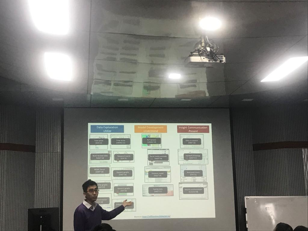 在报告中,赵健博士介绍了他在数据可视化方面的工作。赵健博士指出:几乎每个领域都在生成大量复杂的异构数据。然而,深入了解这些数据仍然是一个根本的挑战我们从哪里开始?我们应该用哪种分析模型,它是如何工作的?我们如何协作分析数据?赵健教授通过他参与完成的三个可视化的项目为到场的师生们讲解了数据可视化是如何解决数据的问题,以及如何通过数据分析的三个主要阶段(包括探索性分析、模型管理和洞察通信)为用户提供支持。数据可视化是对当前数据情况的一种分析,以及对未来的一种预测,这对目前的大数据时代起到了非常重要的分析、预测、辅助决策的作用。