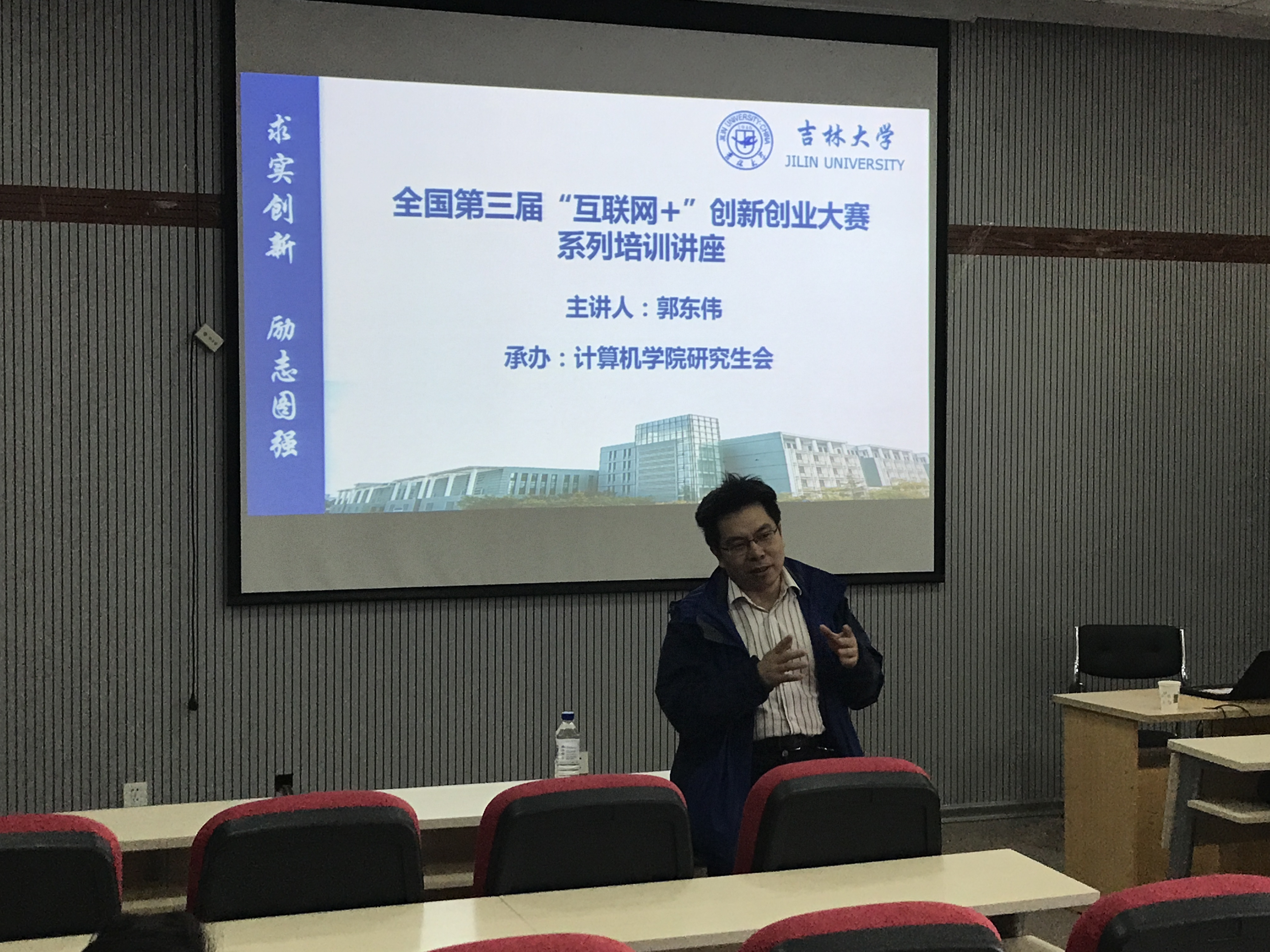 张金山教授讲解之后郭东伟老师又从本次“互联网+”比赛的角度进行了讲解。郭东伟老师是第一届互联网+吉大校赛的评委,资深教练,技术实力很强,经验丰富。他从往年比赛的角度为同学们介绍了很多经验,包括商业计划书的撰写注意事项,一分钟短视频拍摄内容等等。